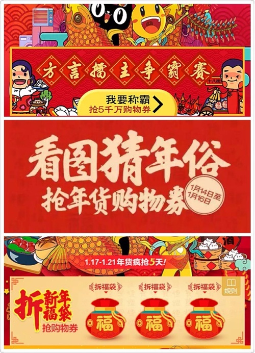 手机淘宝还有“看图猜年俗”、“方言擂主争霸赛”,“拆福袋”等年货节抢购物券的小游戏。