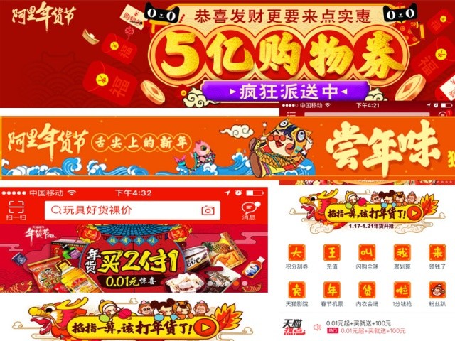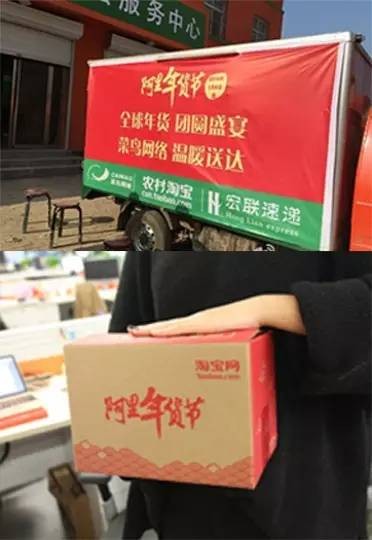项目启动之后,营销也是铺天盖地,首先,自家产品集体换新装、物流车、快递盒、天猫淘宝官网、APP……全部设计成“阿里年货节”主题。
