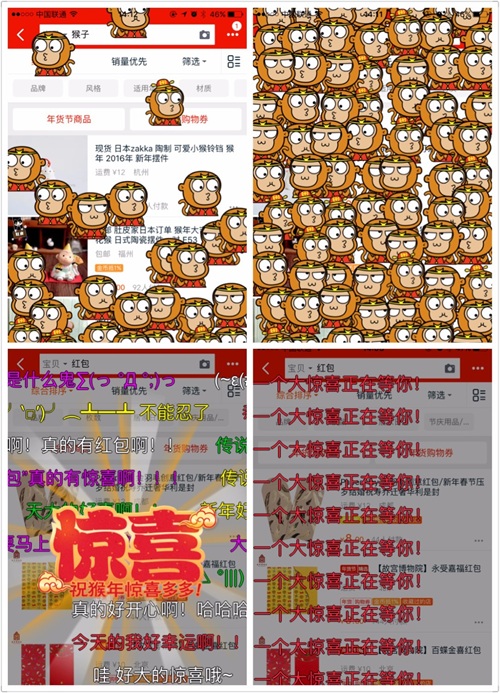 在手机打开淘宝搜索“猴子”,立马从屏幕上方跳下来一堆猴子,占领了手机屏幕。搜索“红包”,居然自带弹幕,淘宝真是越来越会玩了!