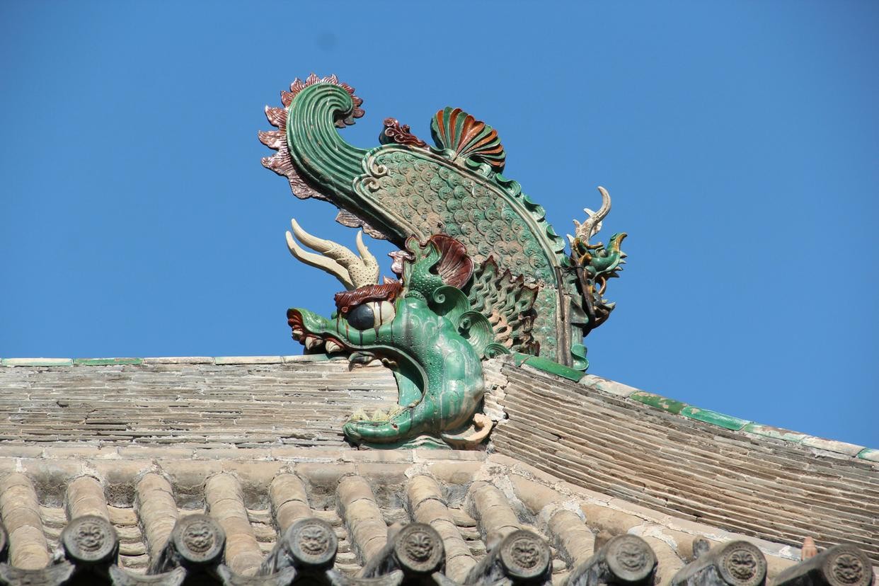 螭吻又称鸱吻或鸱尾,是龙的九个儿子中的最后一个。螭吻具有宽阔的嘴巴和喜欢吞食的特点。他的形象经常被刻在殿脊两端,形成了卷尾龙头的装饰。螭吻的外形类似于去掉尾巴的四脚蛇,他喜欢在险要之处东张西望,并对火焰有着特殊的兴趣。