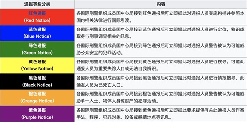 国际刑警组织要犯通报分为7个分类,用以表示不同的目的(而非等级划分)。红色通报表示需要逮捕和引渡,但国际刑警组织在红色通报下加以标注“这些要犯在被司法宣判有罪之前,都视同无罪”,表示被通缉的要犯需在审判后才能定罪。