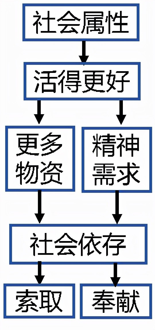 人是社会的产物,人的生产、生活都离不开对群体、对社会的依存。这种依存关系就总体而言又体现在两个方面:其一,是依赖群体、社会作出自己的奉献;其二,是向群体、社会的索取。无论是奉献还是索取,任何人都离不开对于社会的依存关系。