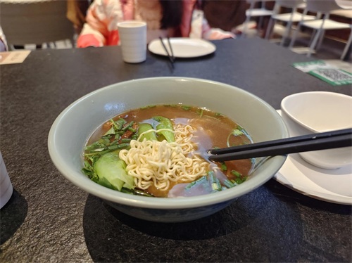 泡了三小时,孩子的肚子也饿了。依依不舍地告别泡池,洗了个舒服的温泉澡,吹干头发,我们来到明悦轩餐厅。这里的服务员非常热情,从沙茶面、牛肉面、捞化当中精选了牛肉面,不过一会儿就端上热气腾腾又香气扑鼻的牛肉面。外加两个蛋挞、一个盐焗鸡腿、一粒温泉煮蛋、两个流沙包,还有自助现磨咖啡随吃随倒,真心吃得好撑啊!