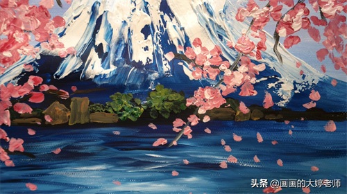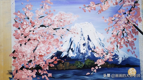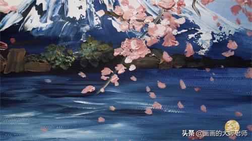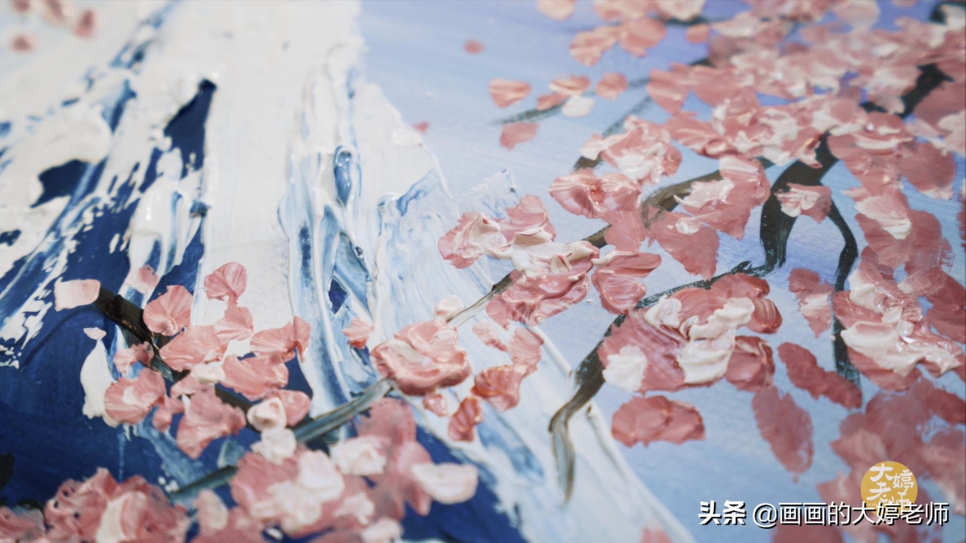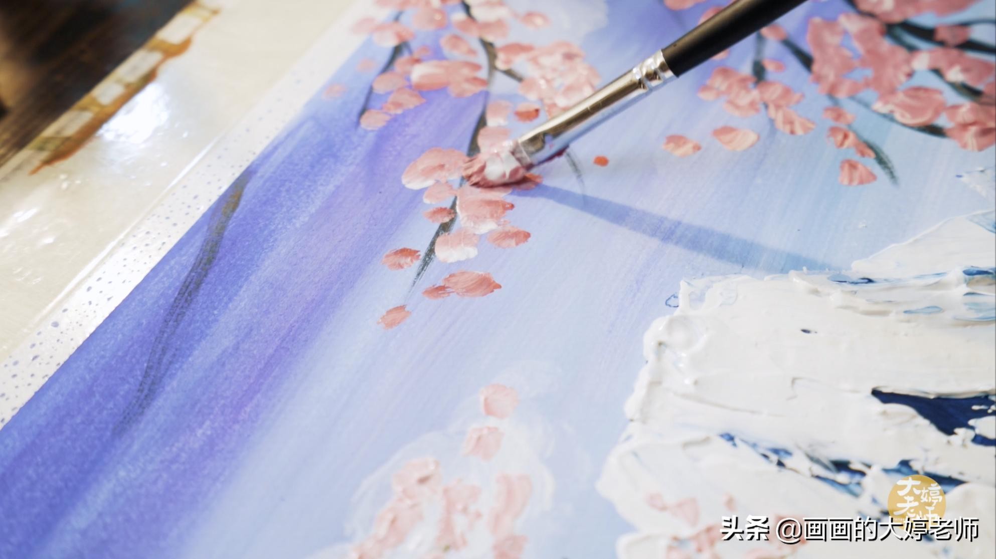 8. 深红(或大红)+ 白色调出粉色,红色少加,白色多加,用点画法画樱花,同样,颜料厚一点,不用调太均匀。