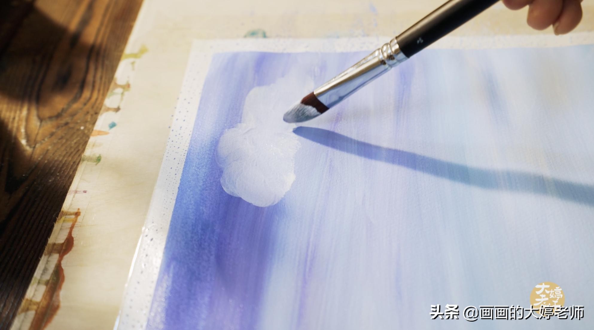 1. 大刷子迅速把背景的天空部分刷完,颜色根据喜好来,偏蓝偏紫偏冷偏暖皆可。颜料稍微多加点水,不用调均匀,画薄点。只需要铺纸的大半部分就行了,下面画其他内容。