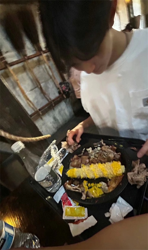 和同学一块聚餐,他喝的是矿泉水,吃的则是西式简餐。