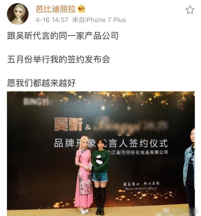 迪丽拉称跟吴昕代言了同一家产品公司,五月份会举行她的签约仪式。照片中,吴昕身穿绿色卫衣配牛仔短裤青春靓丽,跟迪丽拉芭比娃娃的造型相距甚远。