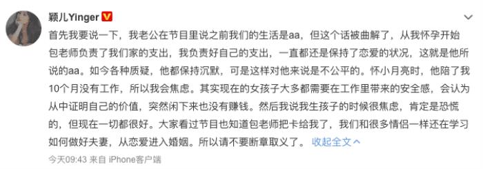 而今天上午,颖儿微博发文维护老公,称:“从我怀孕开始包老师负责了我们家的支出,我负责好自己的支出,一直都还是保持了恋爱的状况,这就是他所说的aa。如今各种质疑,他都保持沉默,可是这样对他来说是不公平的。”