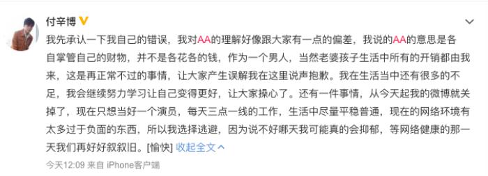 而随后付辛博也出来回应了这件事:“我说的AA的意思是各自掌管自己的财物,并不是各花各的钱,作为一个男人,当然老婆孩子生活中所有的开销都由我来,这是再正常不过的事情,让大家误解我在这里说声抱歉。”