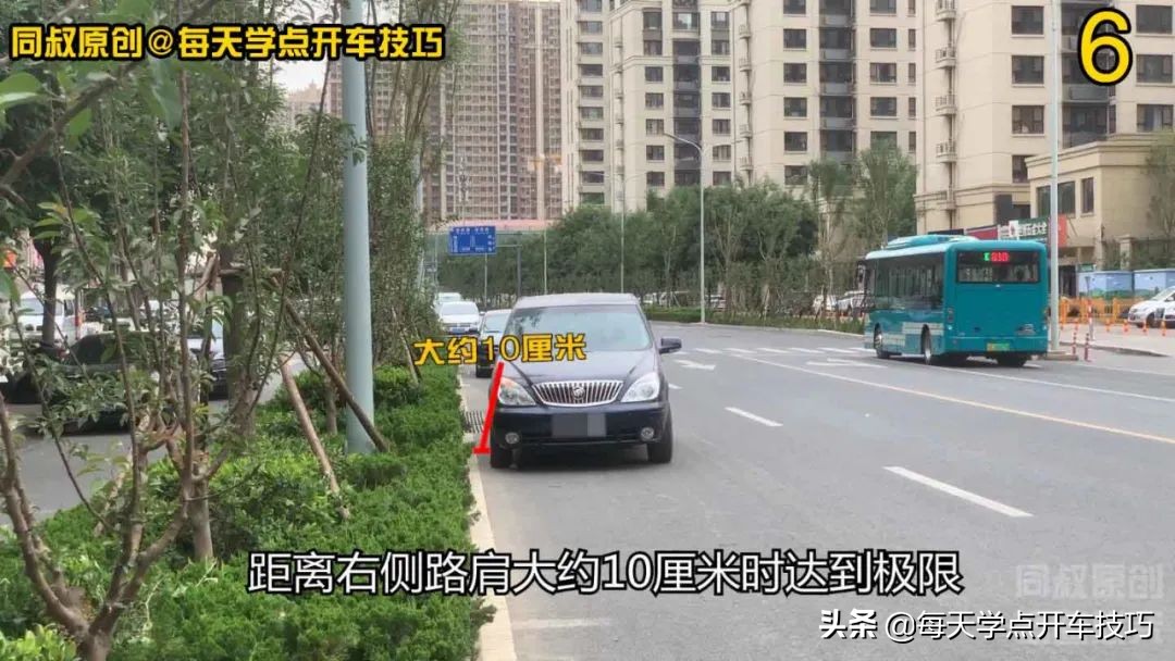 在向左打方向的同时右前角继续前进距离右侧路肩大约10厘米时达到极限,并开始往前顺直车身,