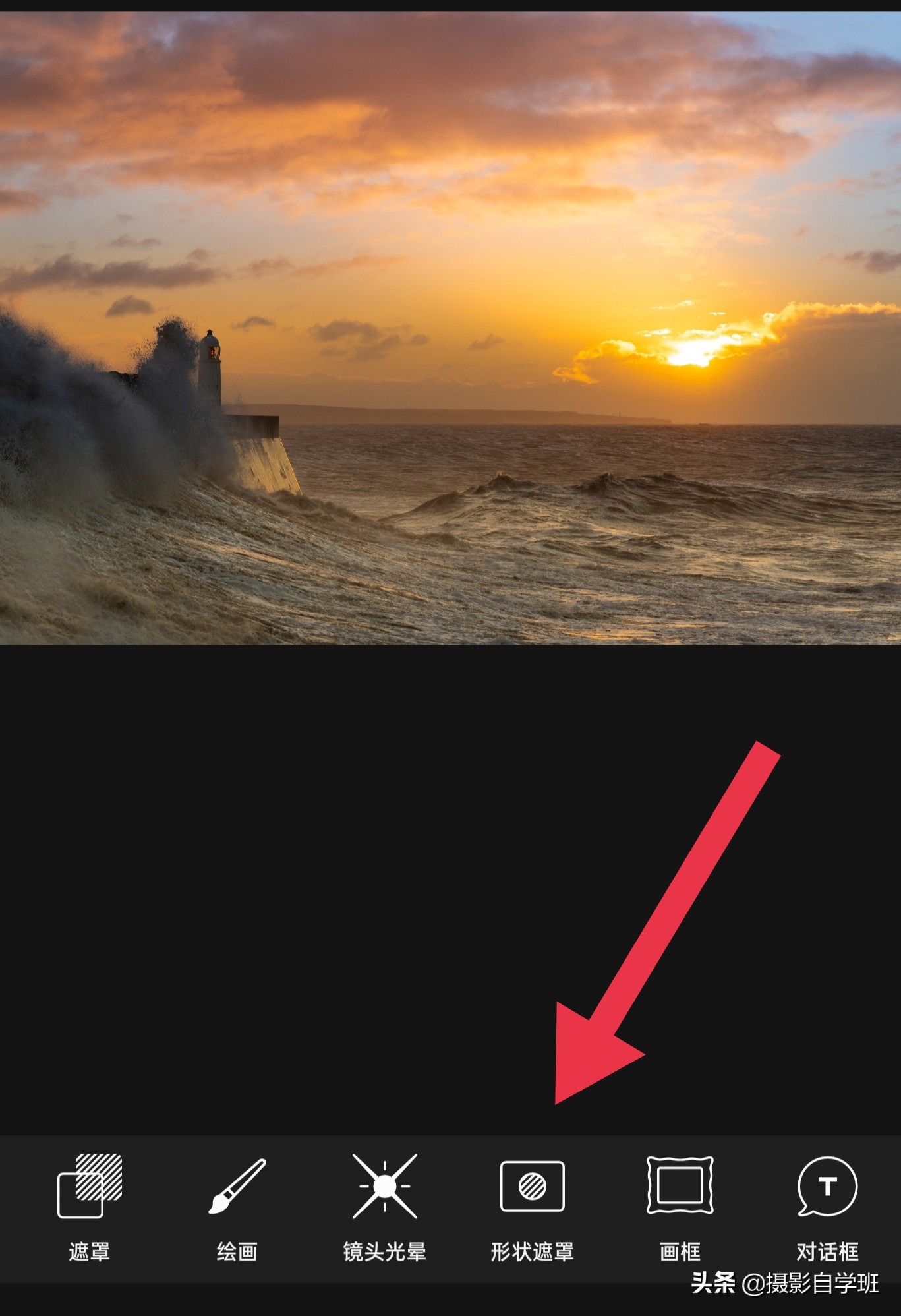 第一步,下载手机修图软件PicsArt,并用它打开你要修的照片。在页面下方,选择形状遮罩。这里有很多功能,形状遮罩,在后面。