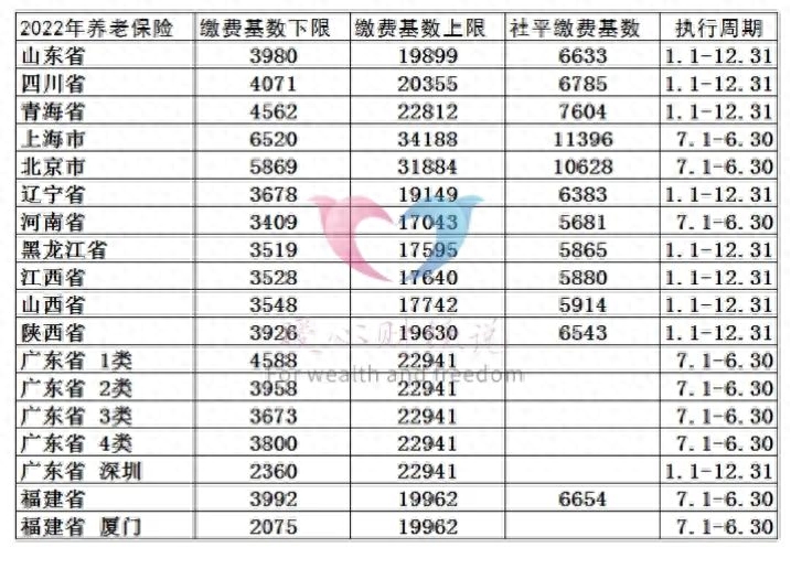 比如说山东省2022年缴费基数上下限为3980元至19899元,四川省为4071元至20355元,青海省为4562元至22812元。当然像北京市、上海市由于一定的过渡政策,暂时没有按照60%确定缴费基数下限。另外,上海市的灵活就业人员缴费比例是24%。