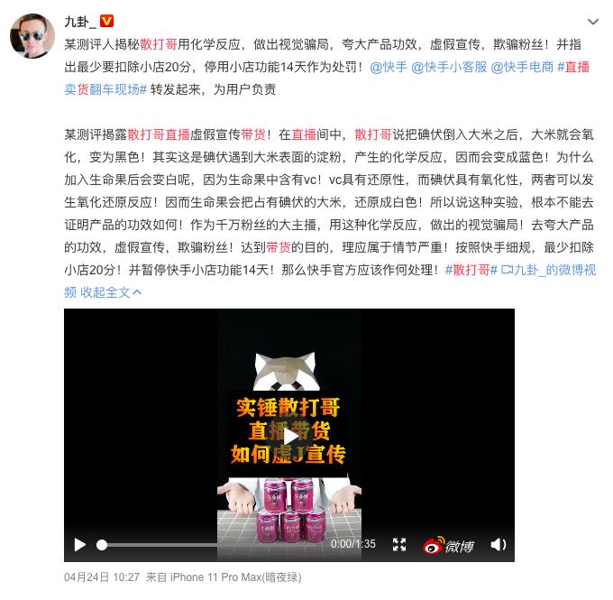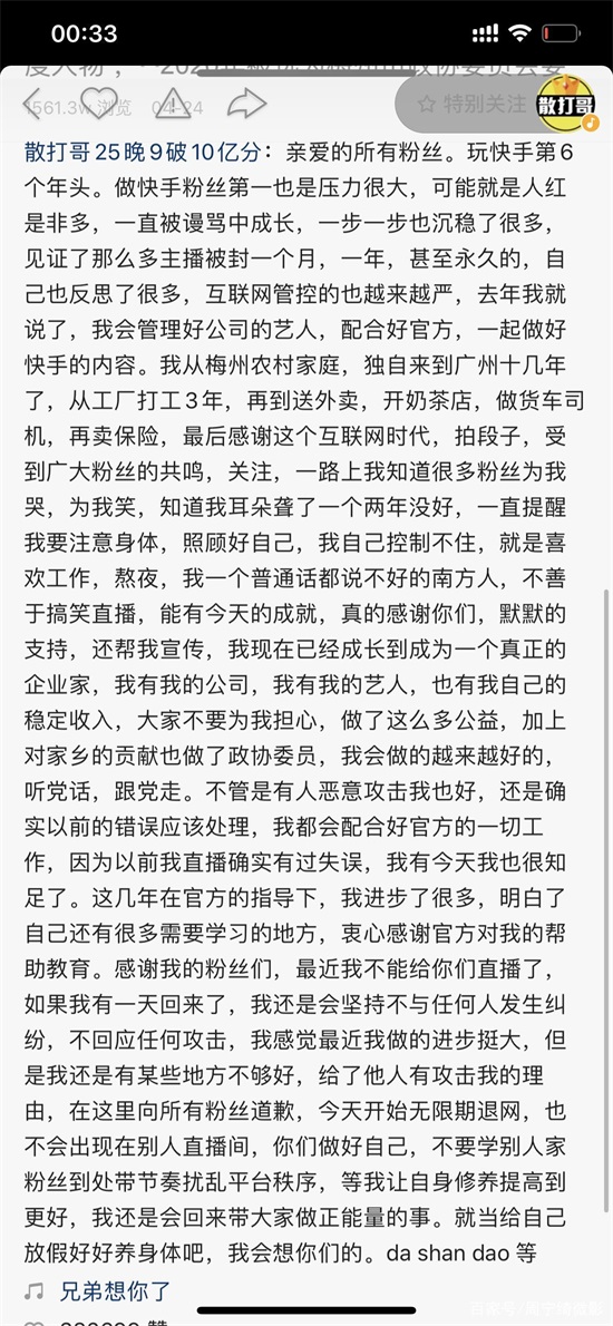 4月24日,粉丝超过5000万的快手主播散打哥在快手发了一条很长的动态,宣布"无限期退网"。