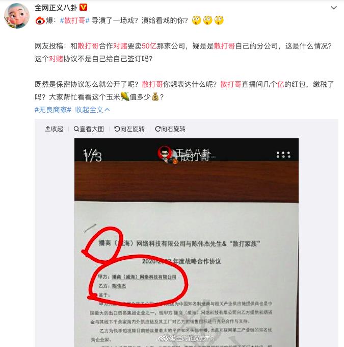 但就是这份鸡血满满、让人上头的对赌合同,却被眼尖的网友发现,上面的甲方公司在某招聘网站的简介赫然写道:"是散打家族运营中心旗下公司之一"。