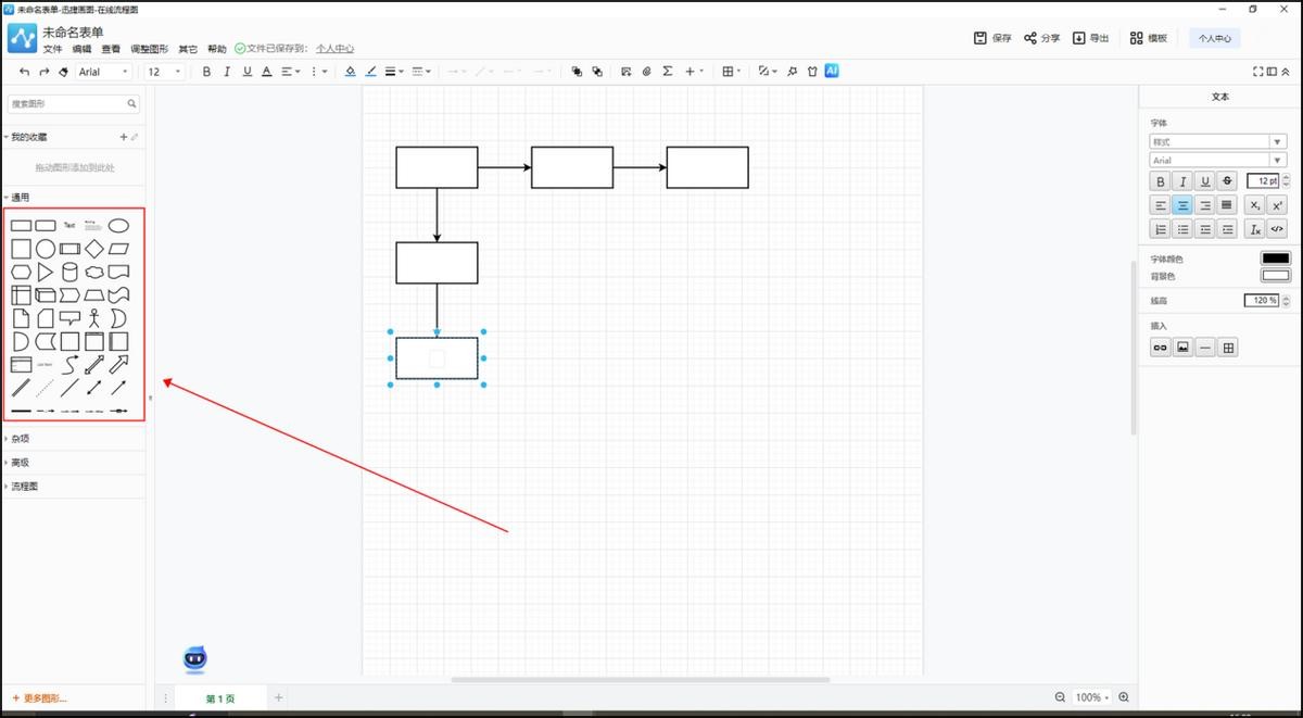 2、在画布上添加节点,每个节点代表一个步骤或一个事件。可以根据自己的需求和喜好选择不同的形状和颜色。首先点击左侧的通用工具栏,然后选择一个形状添加进去。如果想要继续进行添加的话,只需要点击形状上面的小箭头,就可以直接进行添加了。