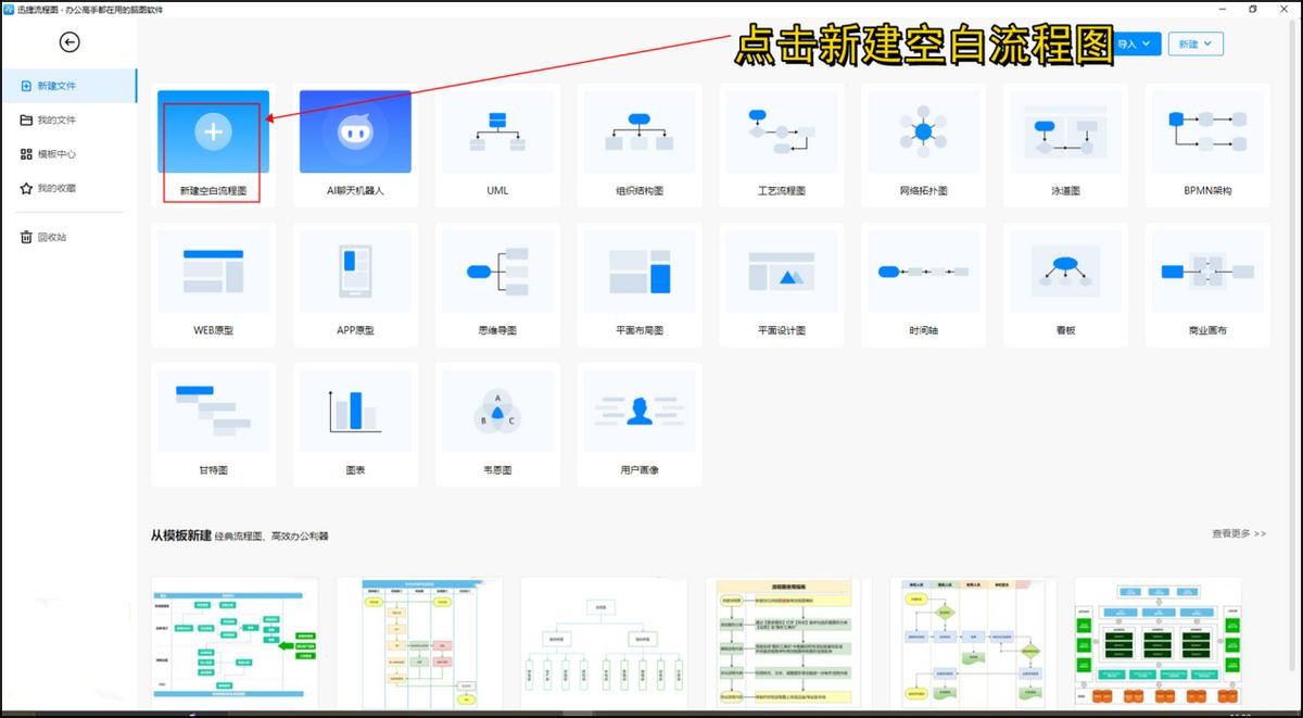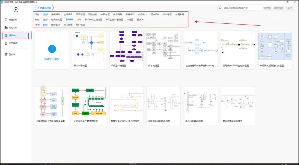 在绘制流程图之前最重要的一点就是找到一个合适的绘制工具,今天给大家推荐一个绘制工具,那就是——迅捷流程图。这个工具是一个简单实用的流程图绘制工具,里面提供了很多流程图绘制模版。只需要点击【模版中心】就可以进入里面下载模版了。