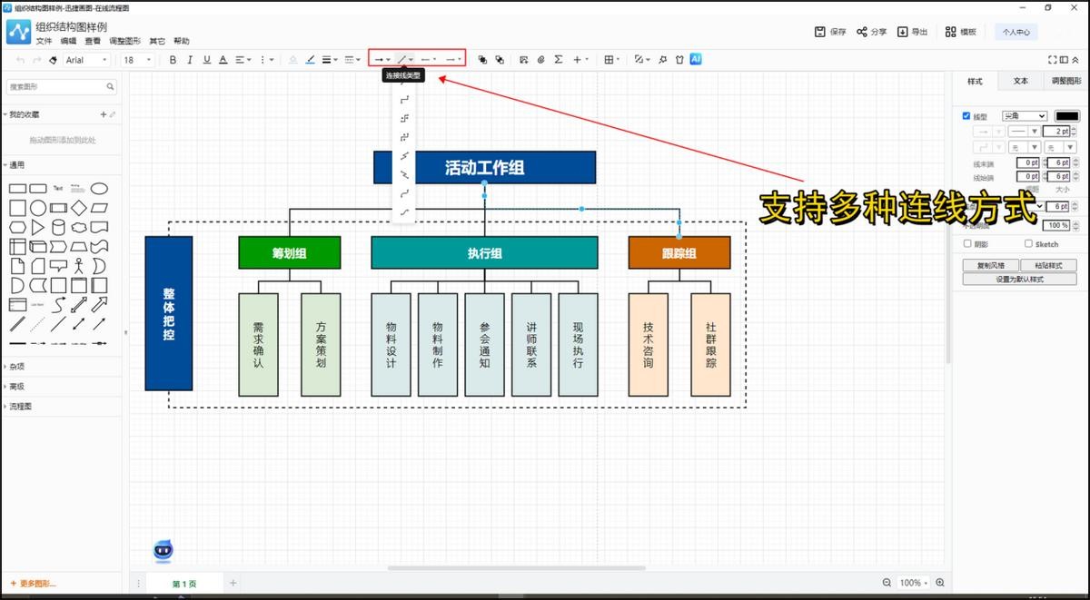 3、添加连接线,将各个节点连接起来,形成流程图的框架。连接线的方向可以根据自己的需求和喜好来选择。这个工具里面提供了好几种不同类型的连接线供大家选择。