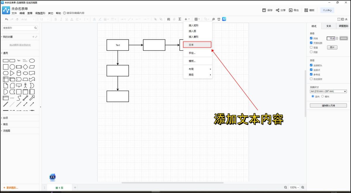 4、添加文本和注释,对节点和连接线进行详细的说明和解释。这样可以让流程图更加清晰易懂。直接点击页面上方的加号小图标就可以选择添加文字和注释了。