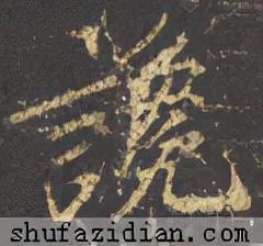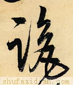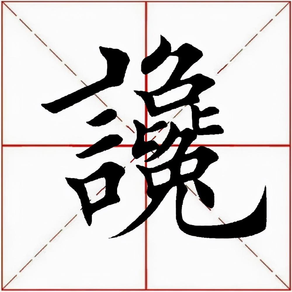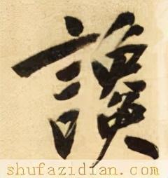 左部“言”旁位置靠上,斜势抗肩,不可写宽。首笔竖点靠右,稍抖起笔,稍重,向下稍左斜,勿长;第二笔横画起笔左探,大抗肩,略呈俯势,勿重,过竖点即收;中间两小横露锋起笔,渐左移,上短下长,抗肩与上面横画协调;下面“口”字稍偏左,抗肩右斜,不要写大。