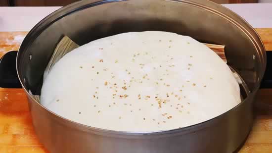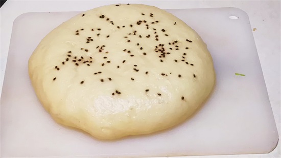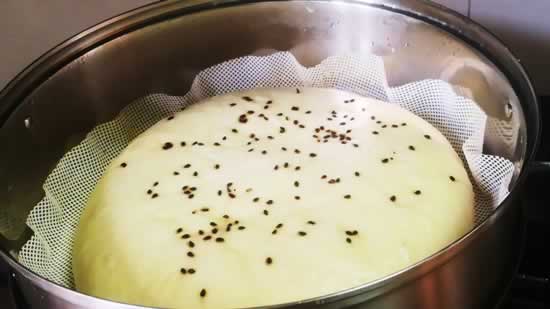 3、醒发的饼上面少刷一点水,再撒点芝麻。再给它放入蒸锅中,凉水上锅,上汽后,再蒸20分钟,焖3分钟,时间到了,盛出来。
