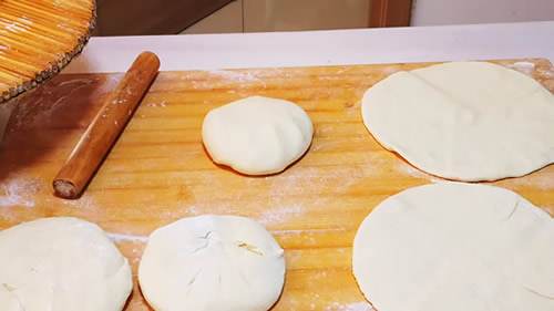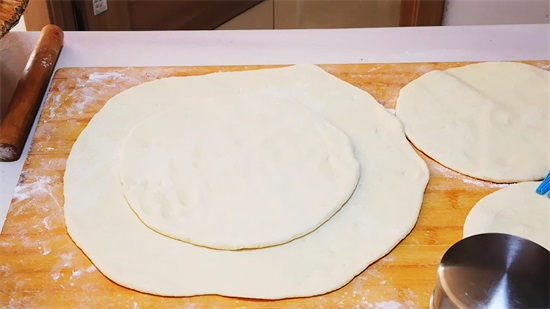 2、大约2个小时左右,面发好啦,长蜂窝状,倒出来揉一揉,搓成长条,分成均匀的面剂,其中有一份面剂要大一点,单独放着。将每个面剂揉一遍,再擀成一个圆饼;再把其中最大的一份放到最底部,在中间的位置放入一点盐,食用油,也可以放点烧烤调料,孜然粉等,可以根据自己喜好来加入调料;我今天就放点盐和食用油,给它涂抹均匀,再依次放入所有擀好的圆饼,最后一层圆饼不要放任何调料,把所有的圆饼做好以后,用最大的一张圆饼给它包裹起来,边缘给它捻紧细了,稍微的把饼按一按,再放一边醒发15分钟。